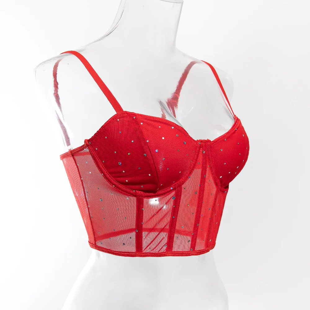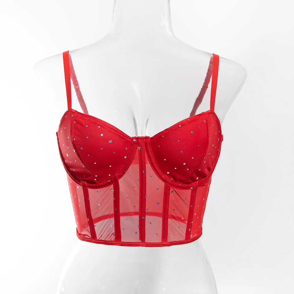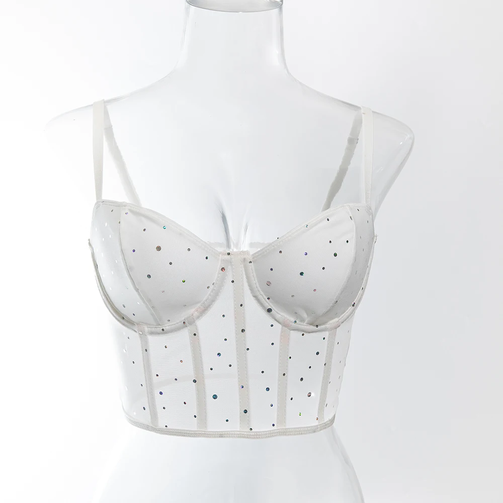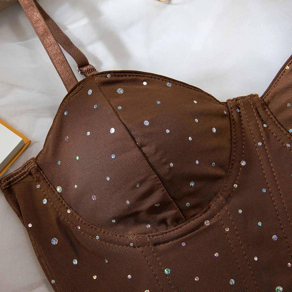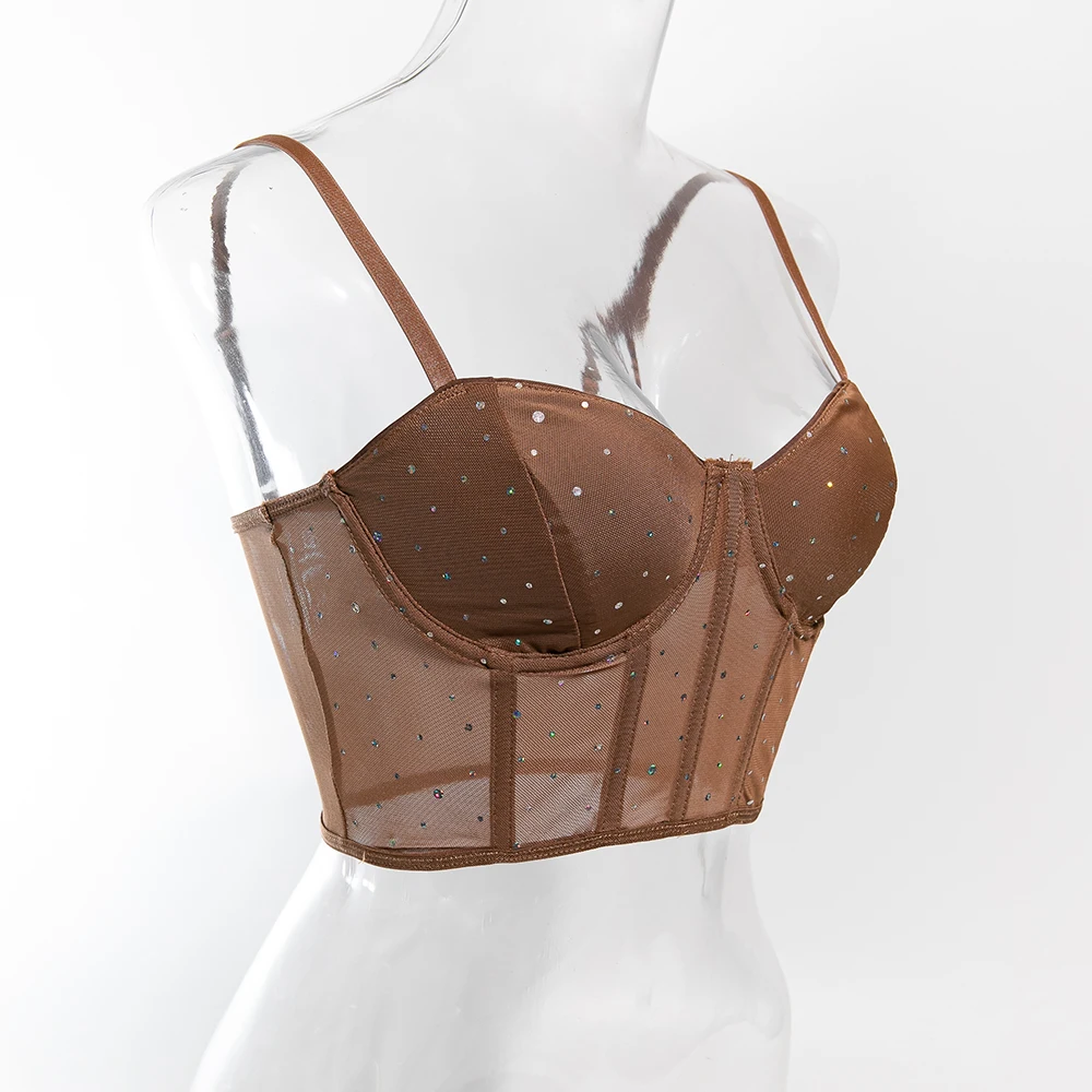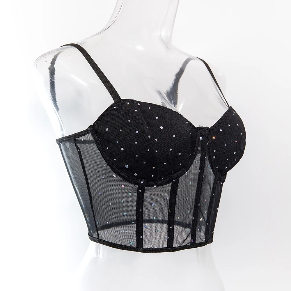 Yimunancy Rhinestone Camisole Women Cropped Top Backless Summer Sexy Mesh Top Blusas