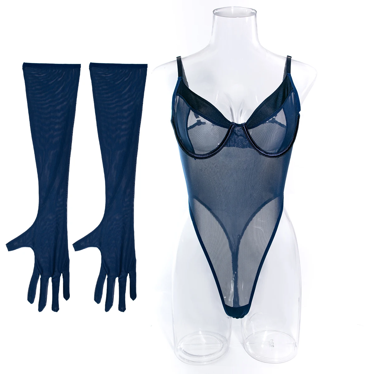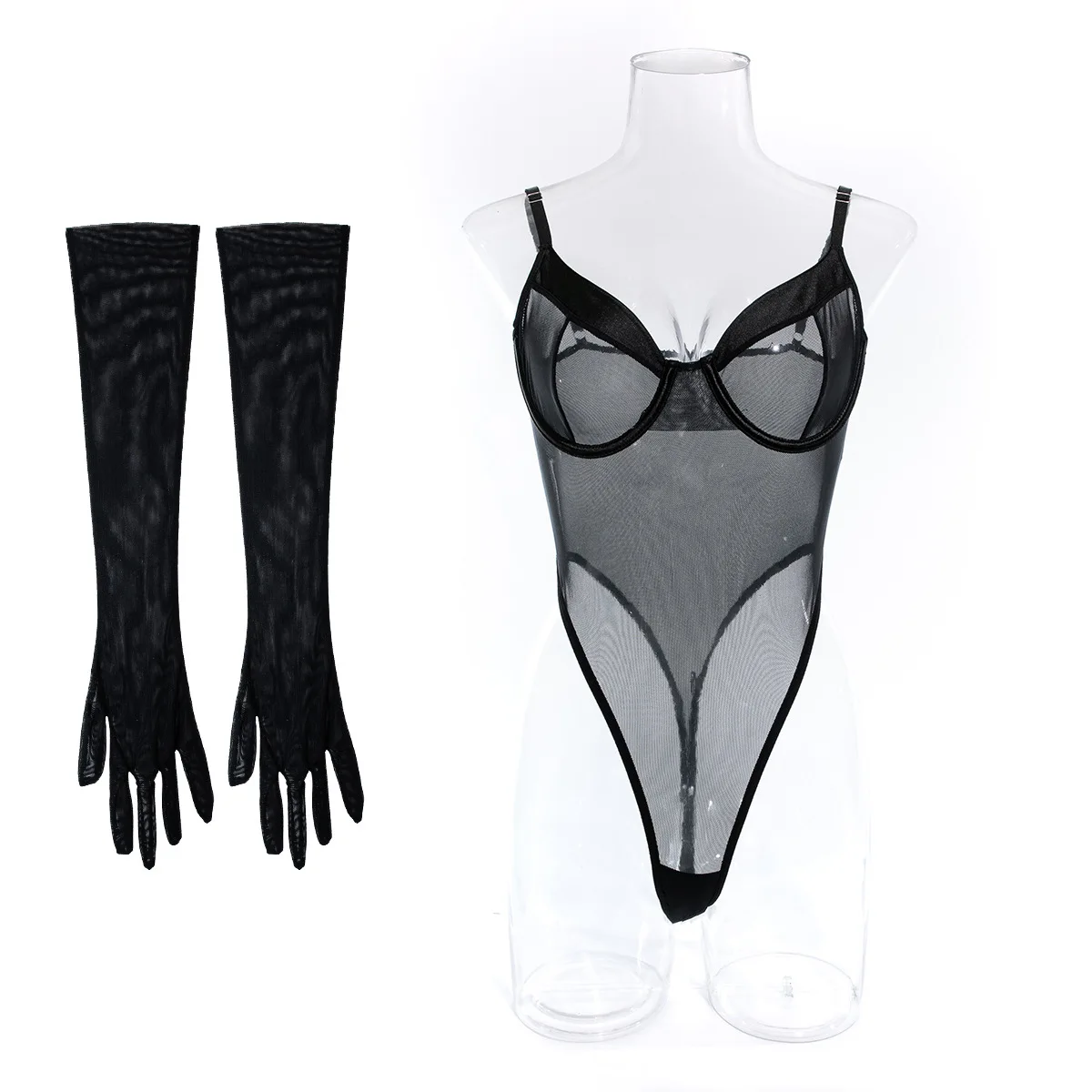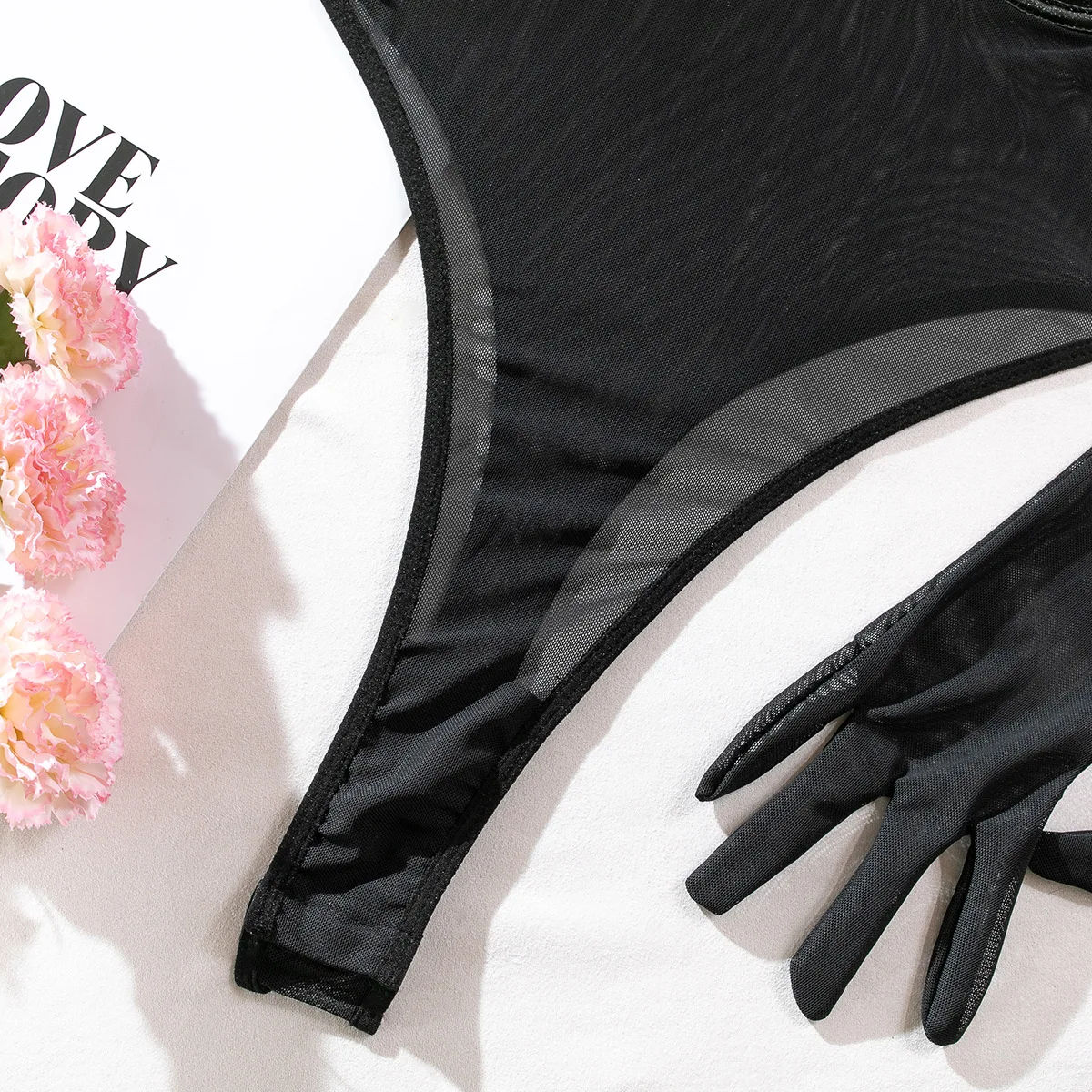 Yimunancy Sheer Mesh Bodysuit Women Patchwork High Cut Skinny Bodysuit Gloves Black Backless Club Body Femme