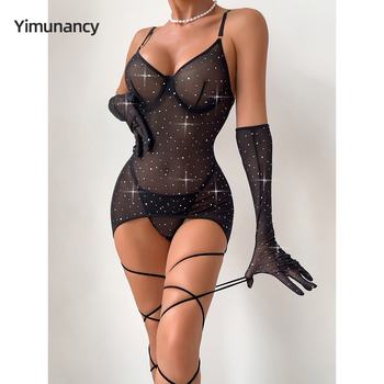 Yimunancy Sequin Transparent Lingerie Set with Gloves Women Mesh 3-Piece Brief Intimates Sexy Erotic Underwear Set Nightwear