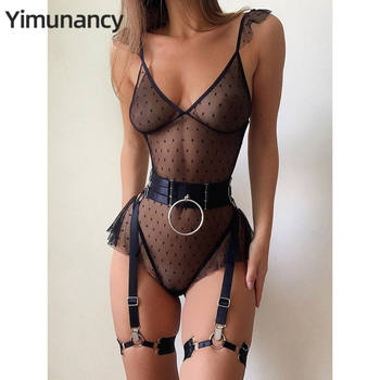 Yimunancy One Piece Lace Sexy Backless Bodysuit Ladies Dot Mesh Sheer Sexy Bodysuit Bandage Body Femme