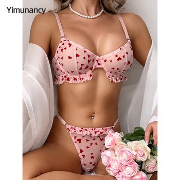 Yimunancy Heart Flocked Lingerie Set Women Transparent Bra + Brief Intimates Transparent Underwear Set