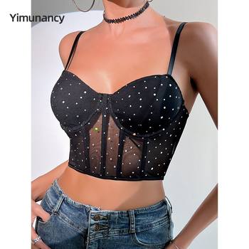 Yimunancy Rhinestone Camisole Women Cropped Top Backless Summer Sexy Mesh Top Blusas