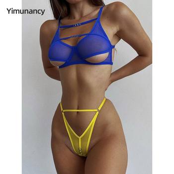 Yimunancy 2-Piece Contrast Color Mesh Cut Out Transparent Lingerie Set Women Sexy Exotic Sets Brief Kit
