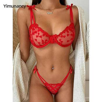 Yimunancy 2-Piece heart embrodiery lace intimates women transparent bow bra + panty lingerie set sexy underwear set