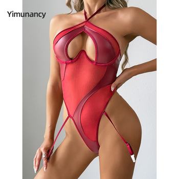 Yimunancy PU leather Halter Bodysuit Women Backless Patchwork Cut Out Mesh Bodysuit Body Femme