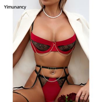 Yimunancy Lace Lingerie Set Women Contrast Color Chain Garter Kit Sexy Underwear Set Erotic Intimates
