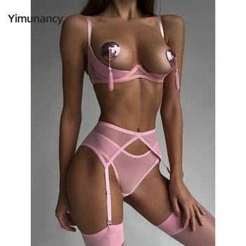 Yimunancy Mesh Lingerie Set Women Transparent Erotic Set Black Sensual Chain Bra Underwear