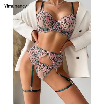 Yimunancy Floral Embroidery Erotic Set Women Transparent 3-Piece 3 Colors Fancy Sexy Lingerie Set Brief Transparent Garter Kit