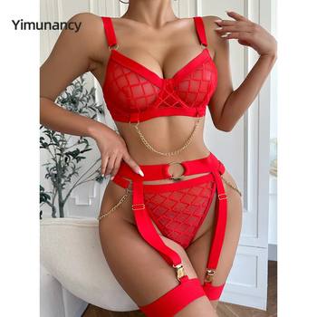 Yimunancy Mesh Lingerie Set Women Transparent Plaid Bra + Chain Brief Sexy Underwear Set Red Erotic Garter Kit